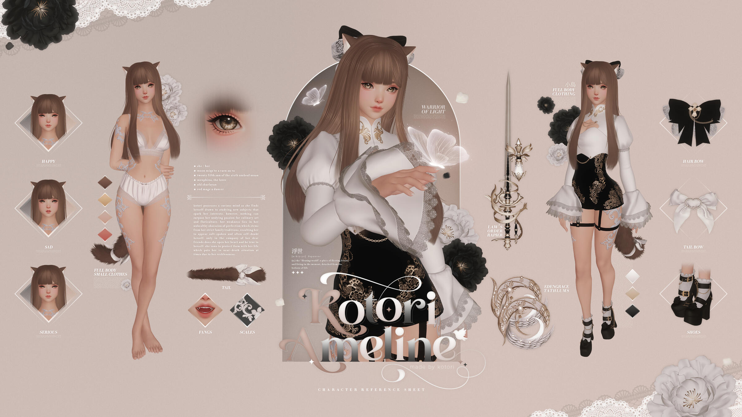 .appearance. born to a keeper of the moon father and raen au ra mother, kotori possesses a feline feature adorned with white and elegant scales. her long, honey brown hair flows down her back, complementing her radiant gold eyes. kotori has a delicate physique of a noble lady, making her better suited for combat from the backline. her fair skin contrasts with her black and white attire accented with intricate gold details. her fluffy tail is decorated with a white ribbon, a gift from her late mother, which she treasures dearly..likes. food. desserts. tea. novels. flowers. trees. stars. ocean. laces. ribbons..dislikes. academics. rules. restrictions. repetitiveness. loneliness. selfishness. heat..hobbies. cooking. baking. gardening. reading. daydreaming. stargazing. combat training.